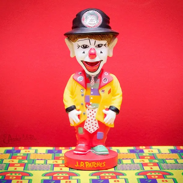 J.P. Patches was the host of one of the longest running local children’s shows in television history. The J.P Patches Show aired on KIRO-TV in Seattle from 1958-1981 and broadcast over 10,000 episodes in its 23-year run. Just about every kid who grew up in the Northwest during that time tuned in as Julius Pierpont Patches, Mayor of the City Dump, entertained them with cartoons, sketches and special guests. This 7" hard vinyl J.P. Patches Nodder is intricately detailed down to the buttons on his coat.