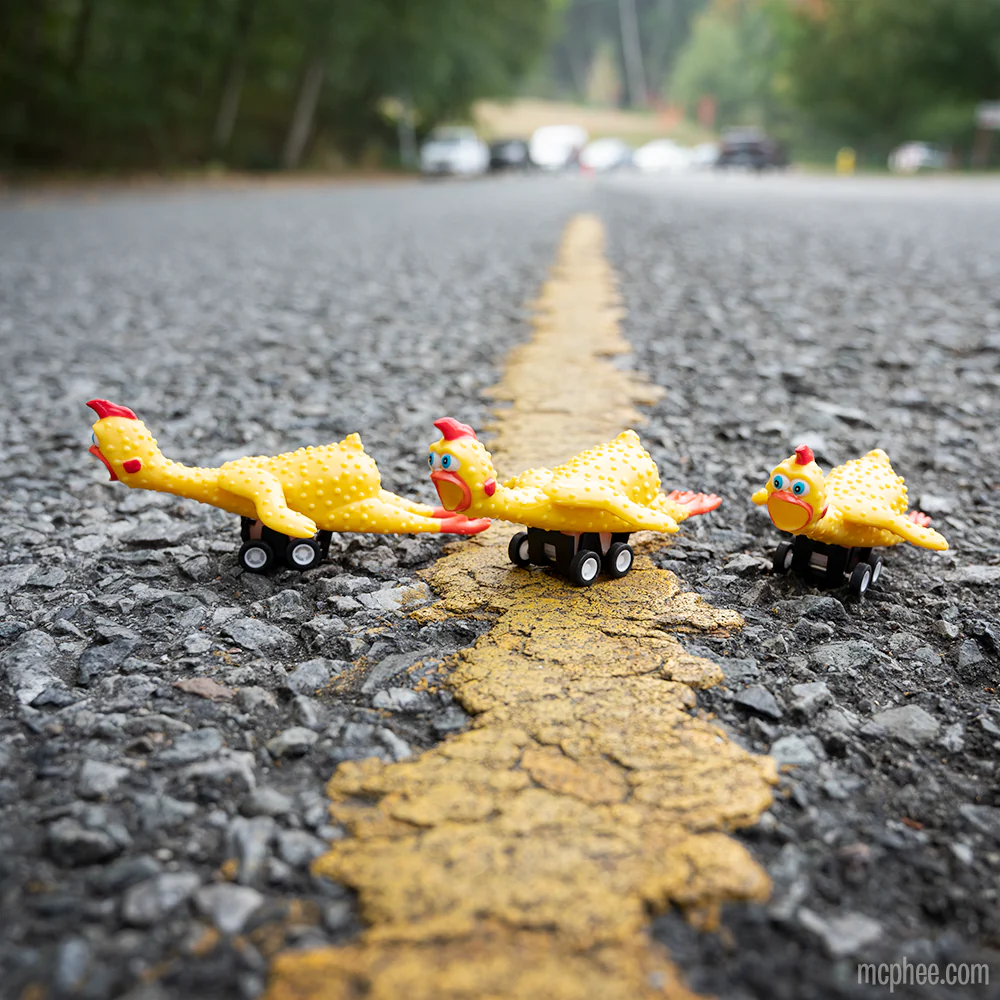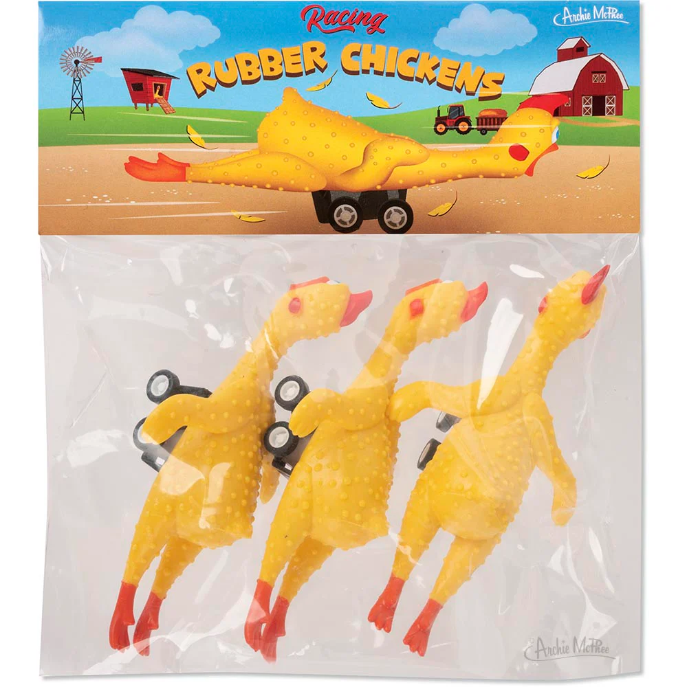 Racing Rubber Chickens are a pull-back, four-wheeled comedy paddywagon of high-speed hilarity! This set of three Racing Rubber Chickens is perfect for a rubber chicken race around the dining room table or you could just play chicken with them. Each 3-3/4" soft vinyl and plastic pulse-pounding poultry projectile will zoom across the road and into your funny bone.